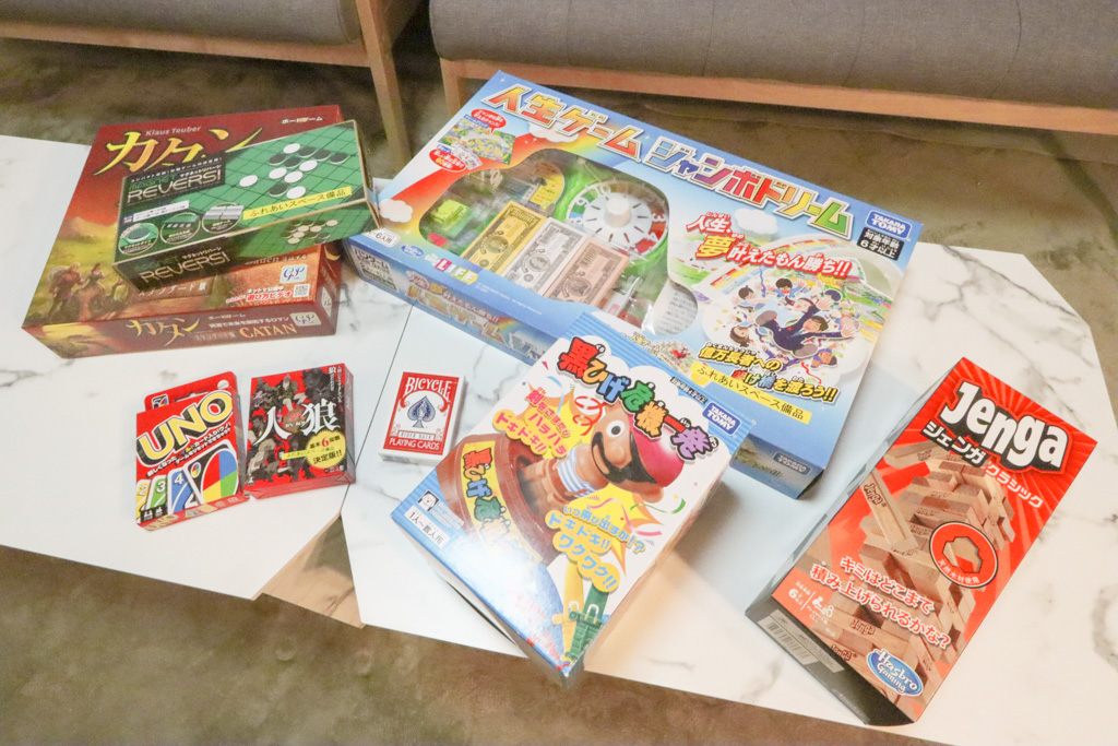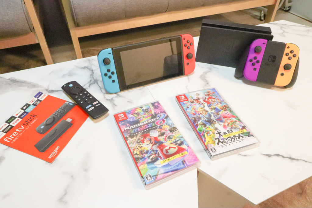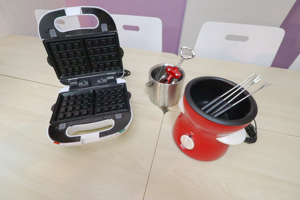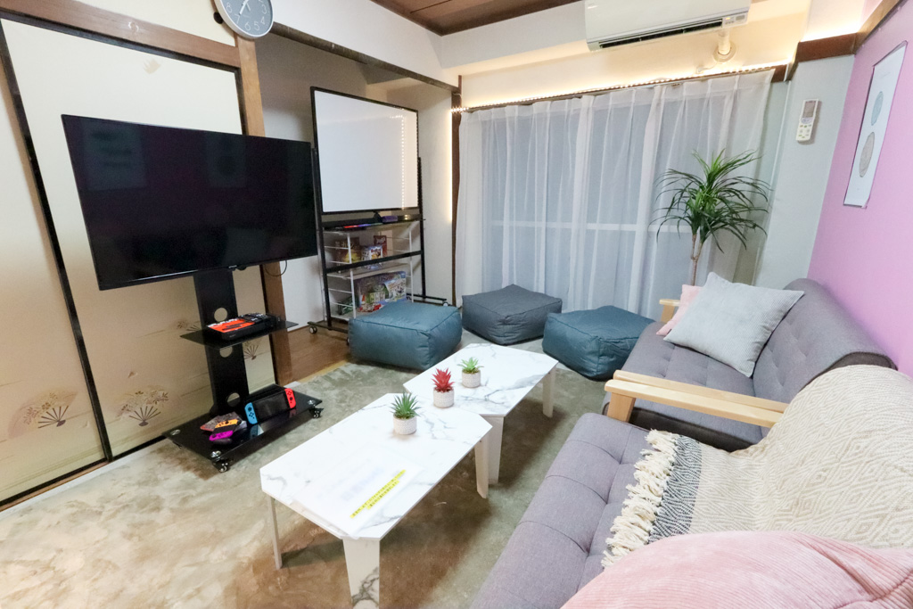 高速Wi-Fiやホワイトボード、43インチの大型液晶モニターなども基本的な設備のほか、キッチングッズ、switch、カタンなどのボードゲーム、チョコ・チーズフォンデュ鍋まで完備!!